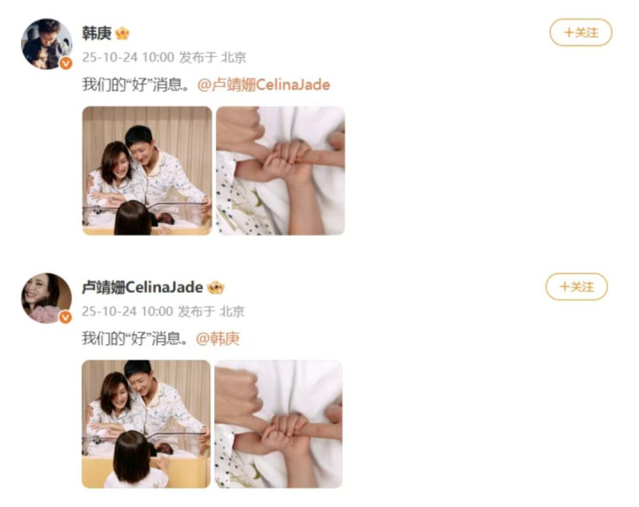 10月24日,韩庚和卢靖姗夫妇高调官宣,发出我们的“好”消息,官宣二胎生子。